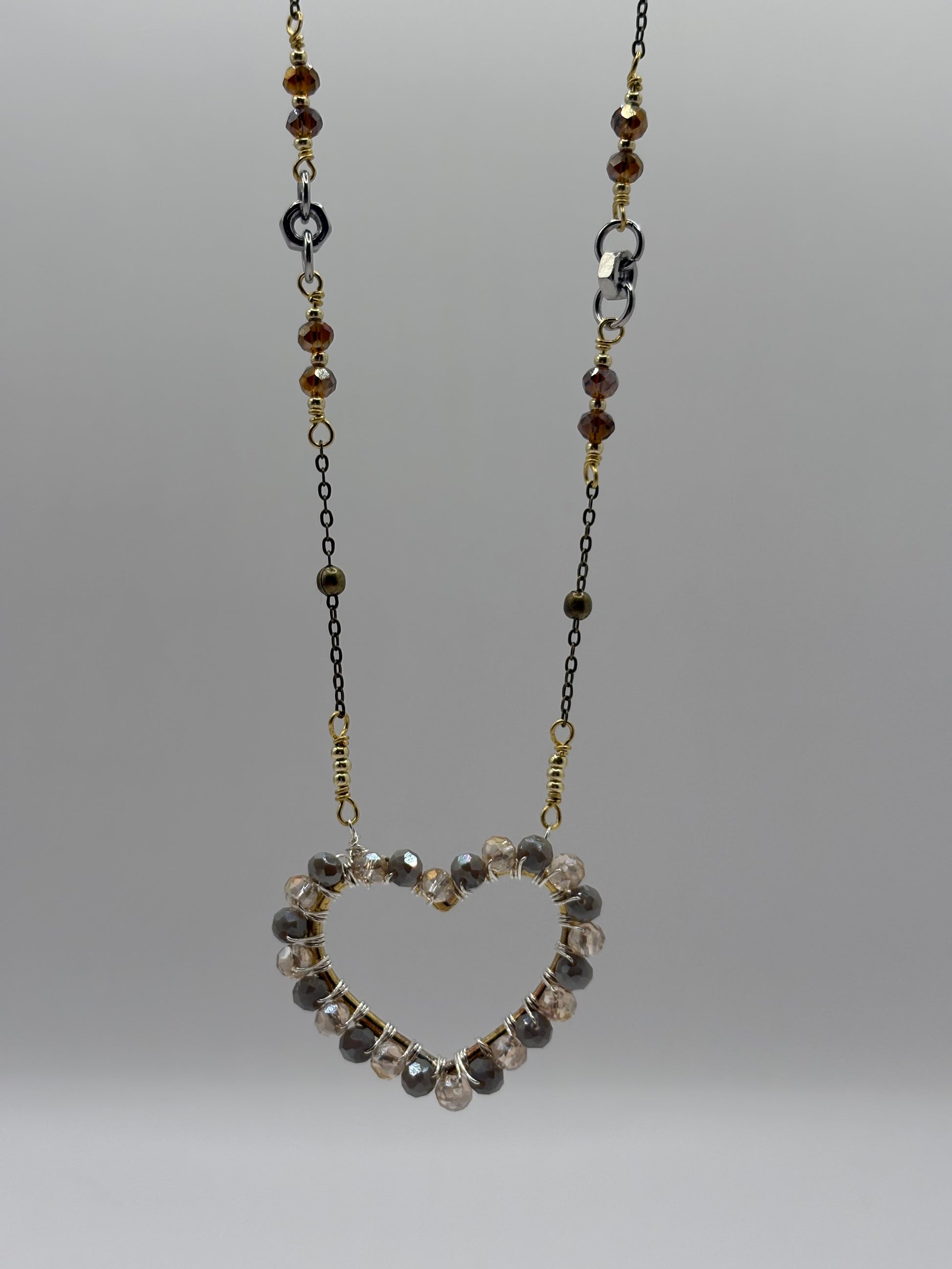 Un ciondolo scintillante, interamente realizzato a mano partendo dal filo in ottone, anima del cuore, rivestito da cristalli luminosi sui toni del tortora e miele.