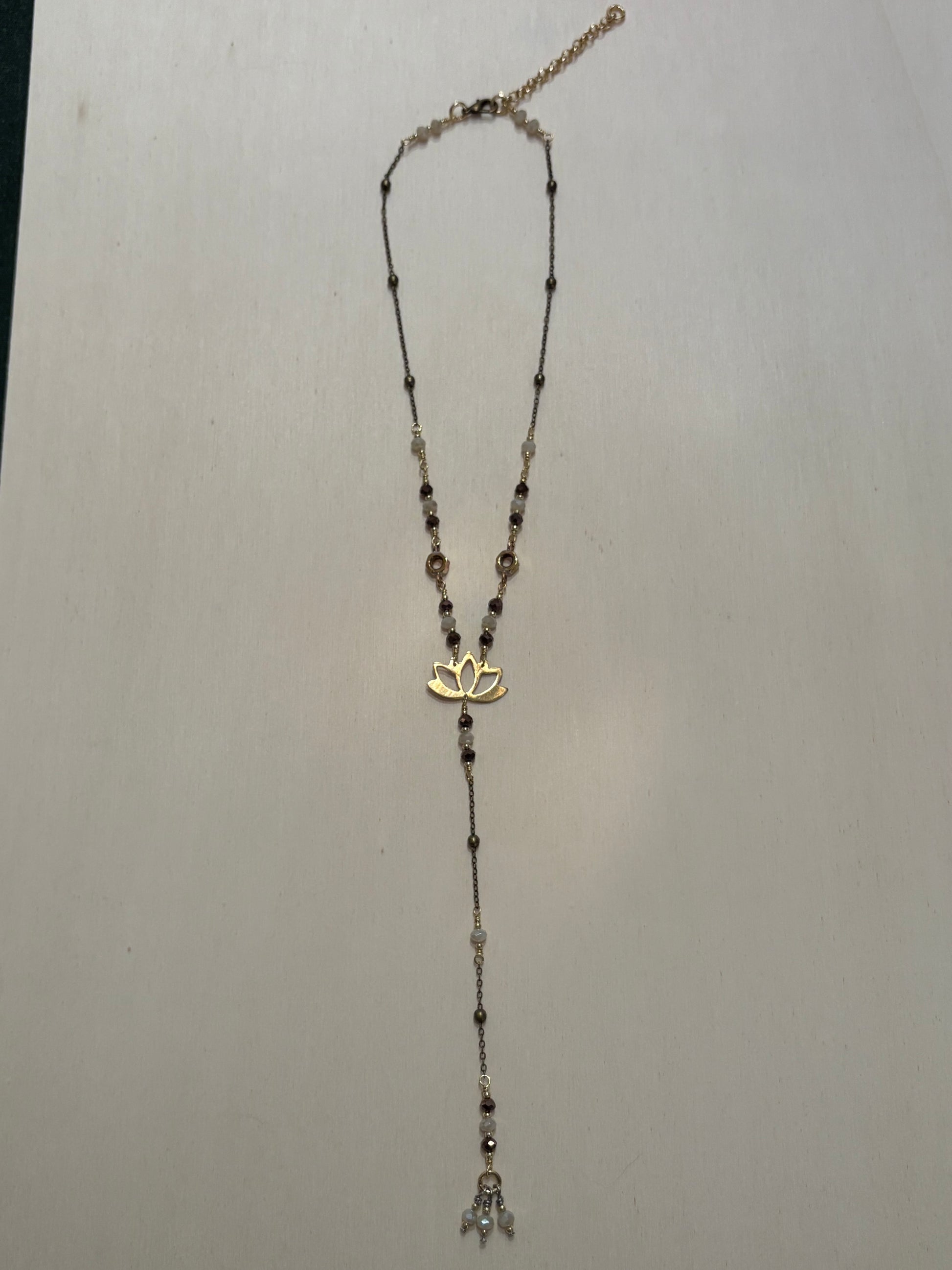 Un ciondolo centrale a forma di loto, interamente realizzato a mano partendo da una lastra in ottone. Ogni dettaglio è unico, ogni pezzo è diverso, con piccole imperfezioni che lo rendono autentico, irripetibile e profondamente artigianale.