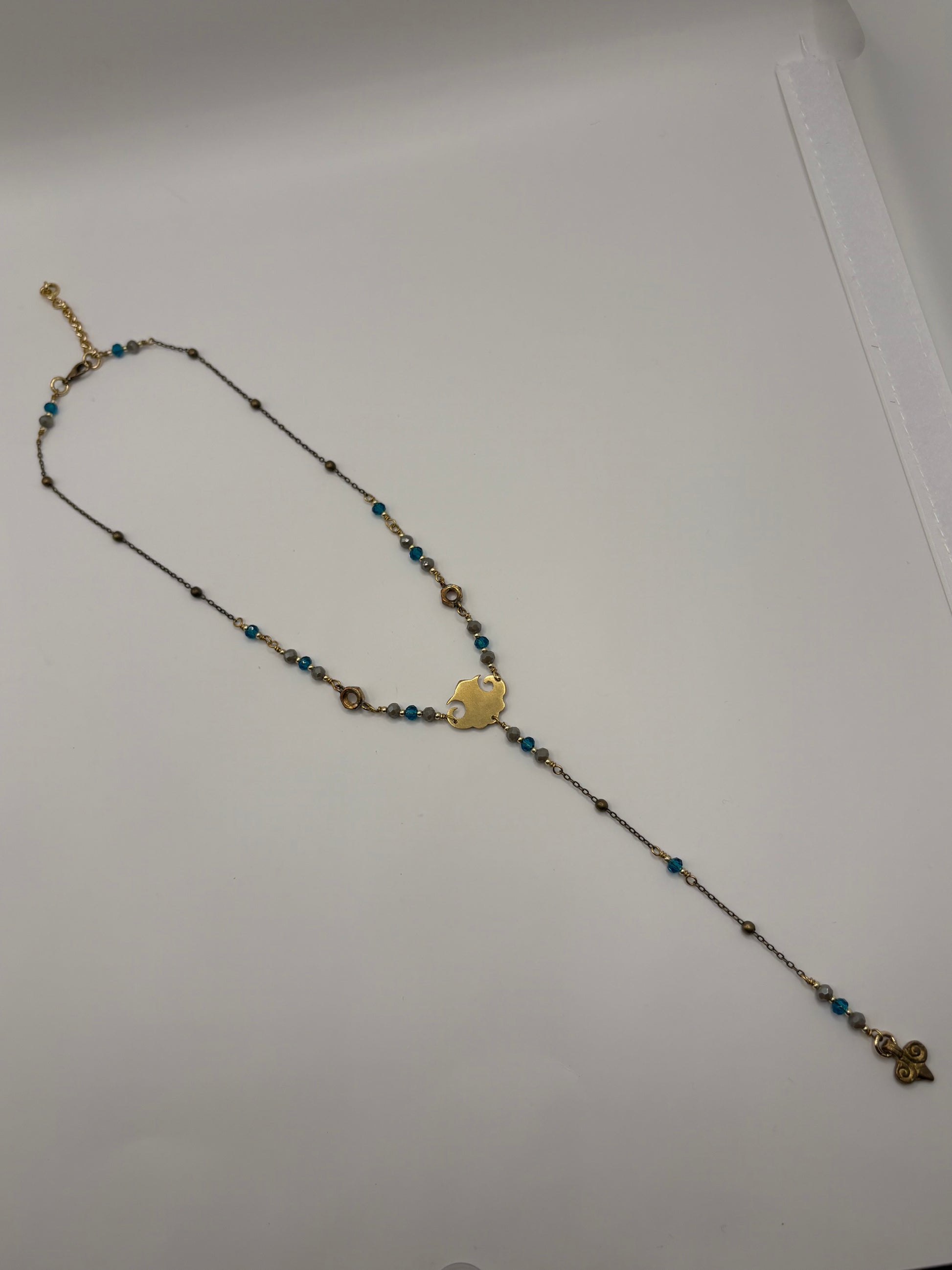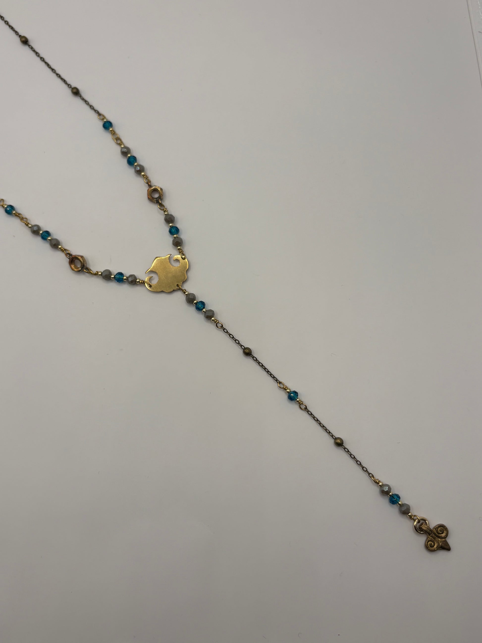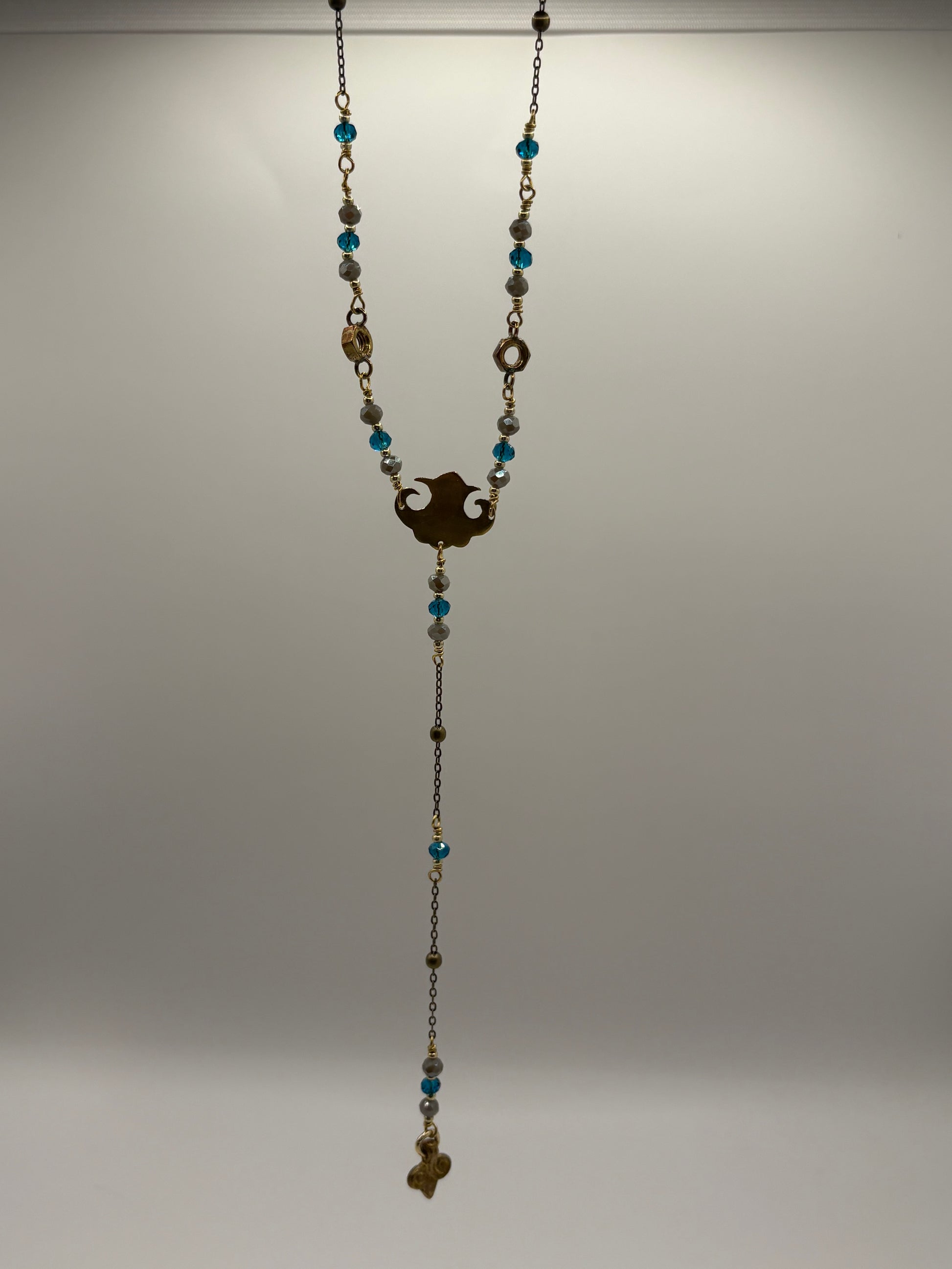 La catena a Y è fatta a mano e curata in ogni dettaglio: cristalli dai toni dell’acquamarina e tortora e gli inconfondibili dadi in ottone, a cui sono state saldate le anelline.