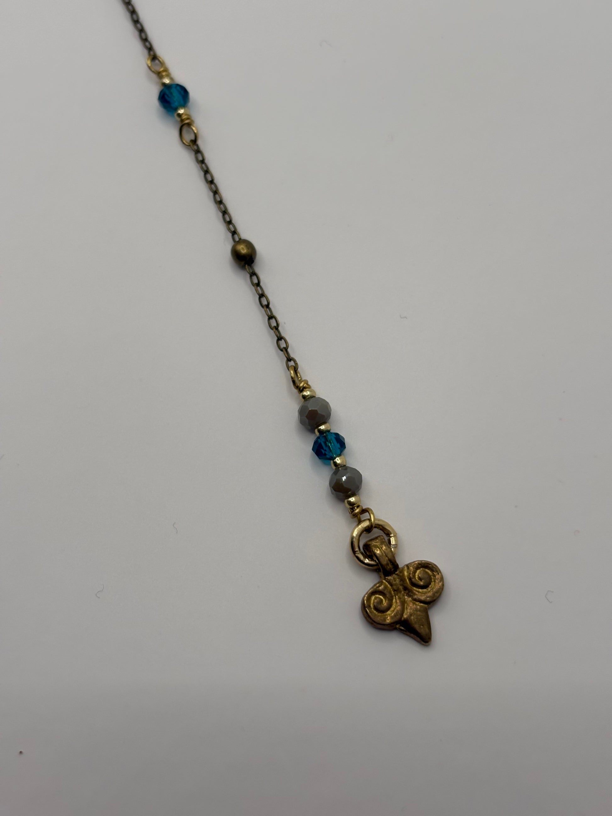 Un ciondolo centrale che ricorda un giglio o uno stemma regale, interamente realizzato a mano partendo da una lastra in ottone. Ogni dettaglio è unico, ogni pezzo è diverso, con piccole imperfezioni che lo rendono autentico, irripetibile e profondamente artigianale.