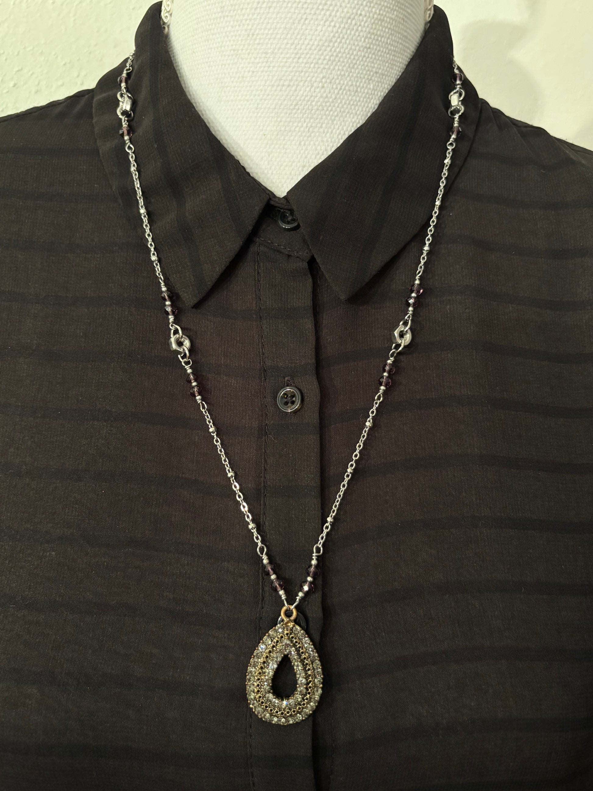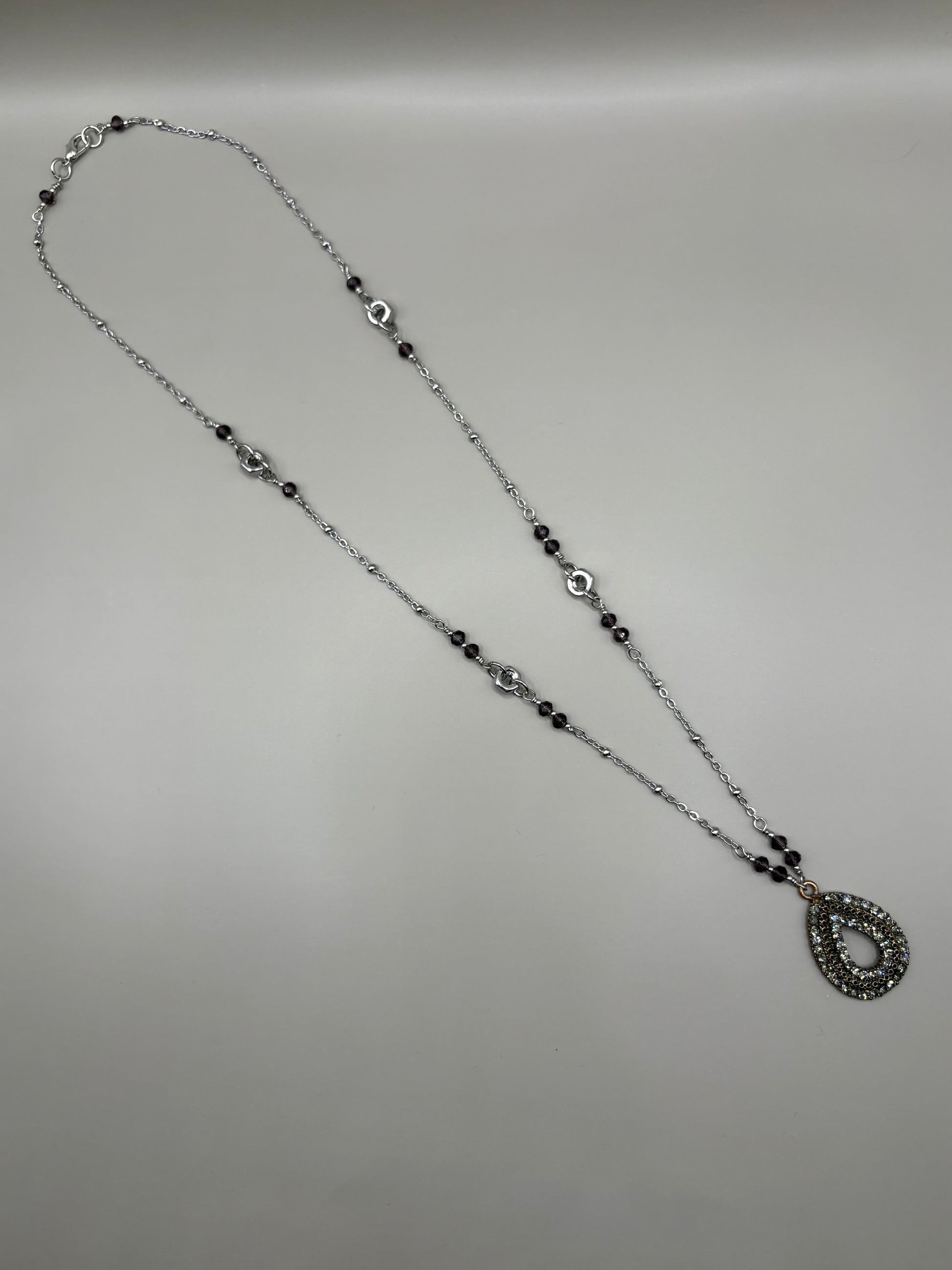 Collana realizzata a mano in acciaio inossidabile. Il ciondolo è il componente di un vecchio orecchino che ho riutilizzato per illuminare questa splendida collana. La catena è caratterizzata da cristalli colorati sui toni del viola, dadi in acciaio inossidabile e catena con palline in acciaio inossidabile.