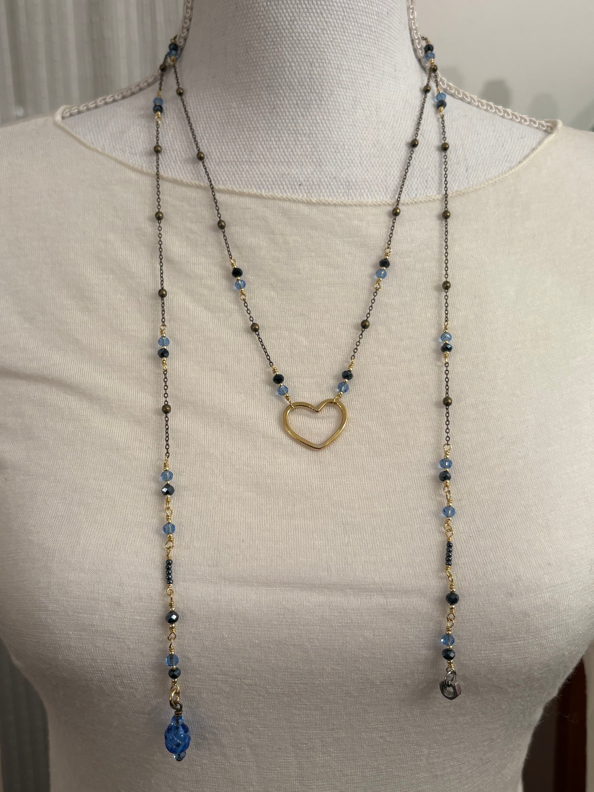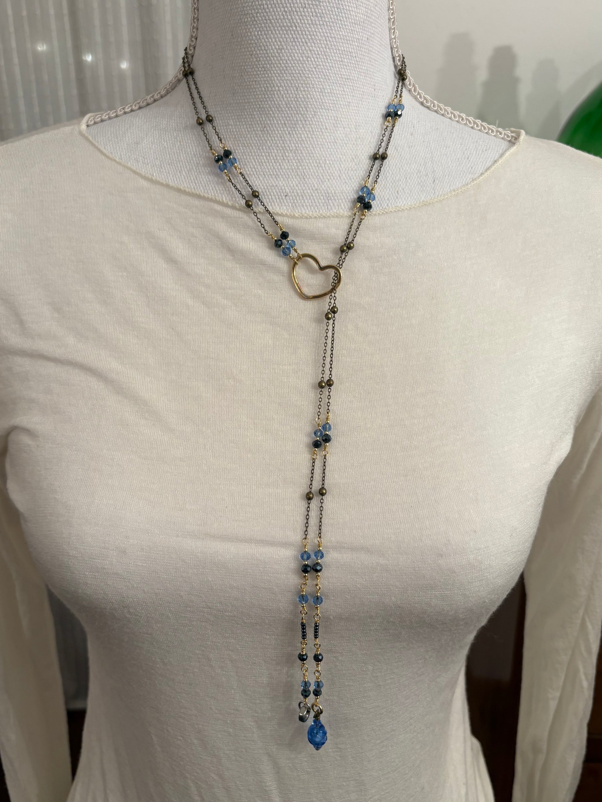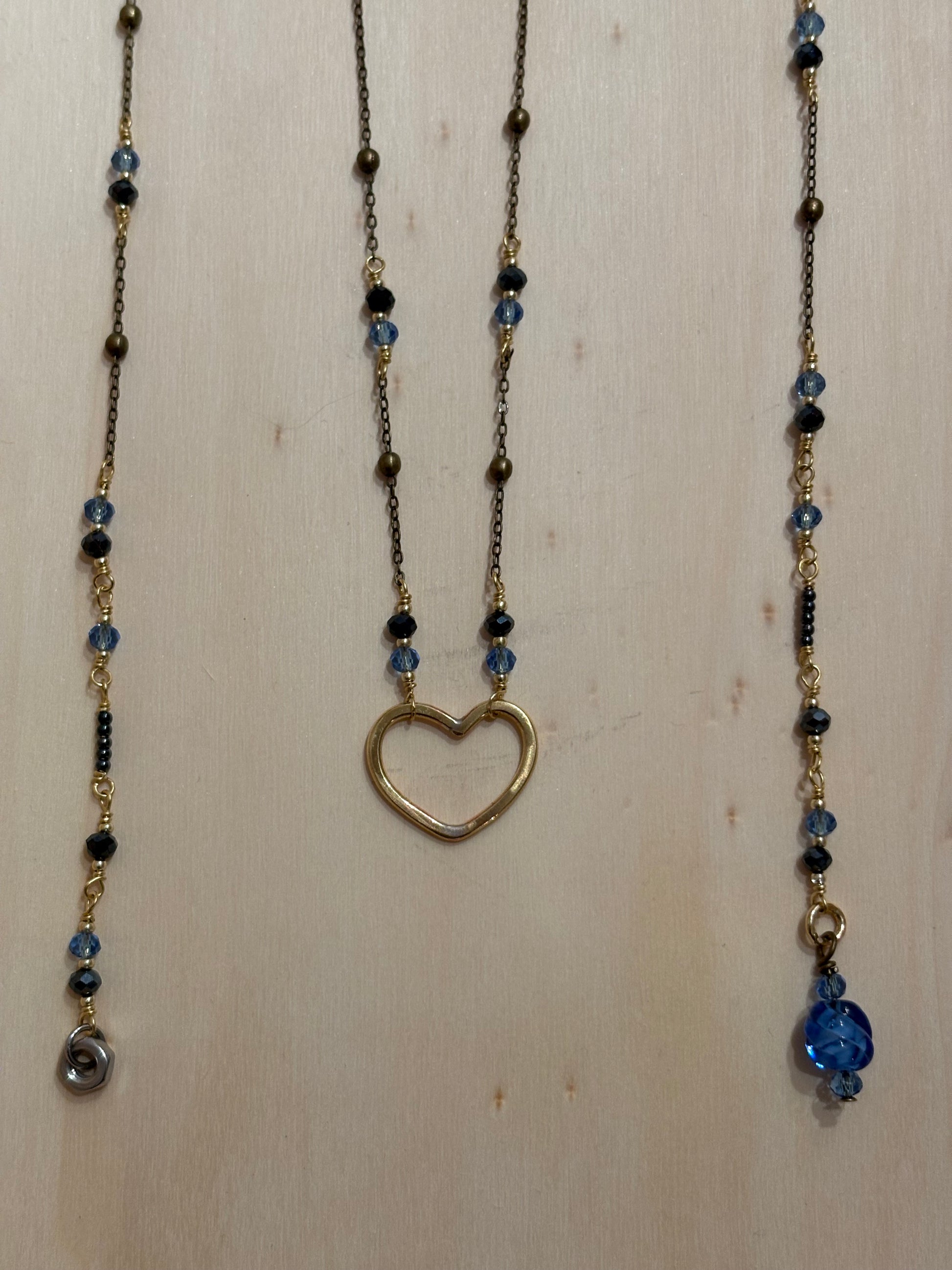 Un ciondolo centrale a forma di cuore, interamente realizzato a mano partendo da un filo in ottone, saldati e battuto.