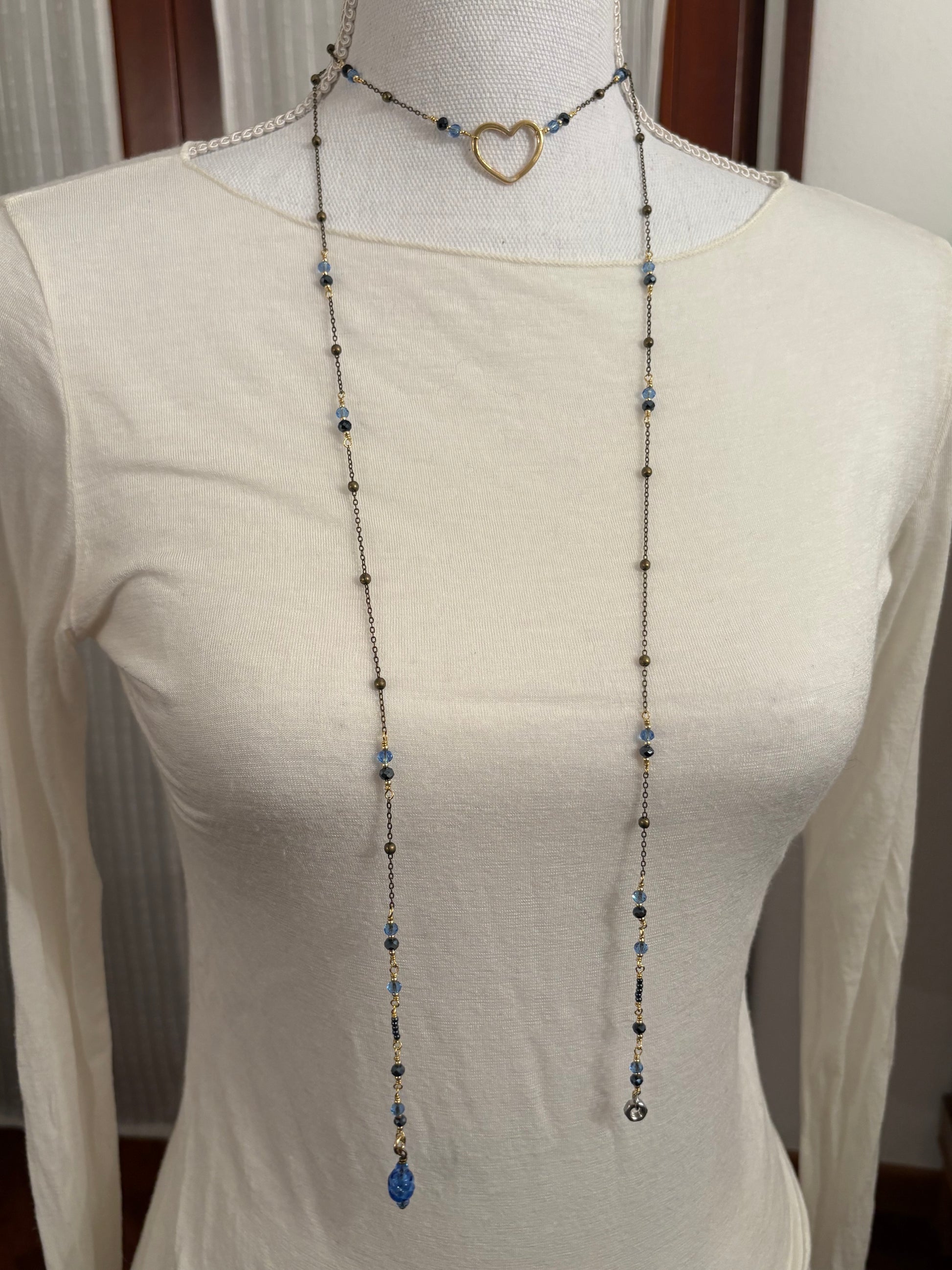 La catena é senza chiusura: è fatta a mano e caratterizzata da cristalli dai toni del blu. In fondo, un dado da un lato e un pendaglio dall’altro.
